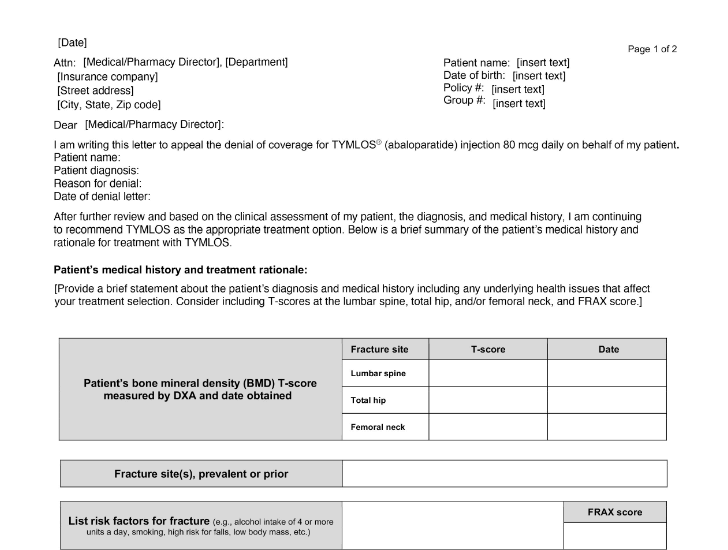 A letter to use as a template for submitting an appeal when a health plan denies TYMLOS coverage.