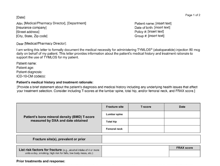 A letter to use as a template when health plans require a PA request form to satisfy their policy requirements to obtain TYMLOS coverage.