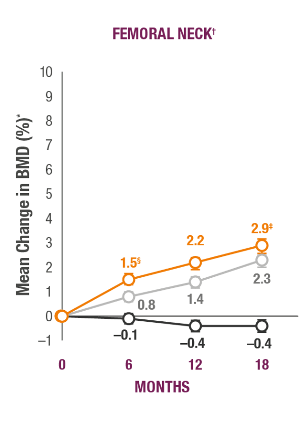 ¶BMD changes at lumbar spine vs teriparatide at 6 months was a forced exploratory endpoint due to hierarchical study design.2