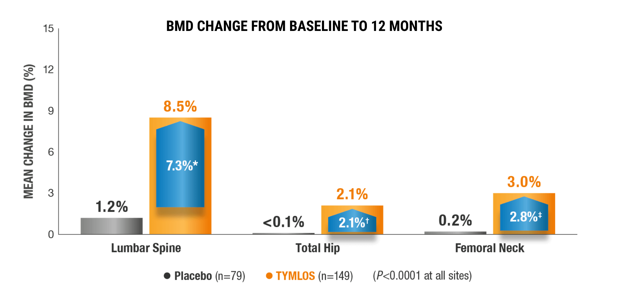 TYMLOS quickly and significantly increased BMD in vertebral and nonvertebral bone.1,2