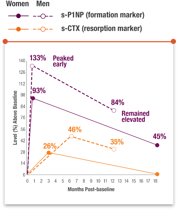 Greater increase of bone formation over bone resorption markers was sustained for the duration of therapy in men and postmenopausal women.1,4,5